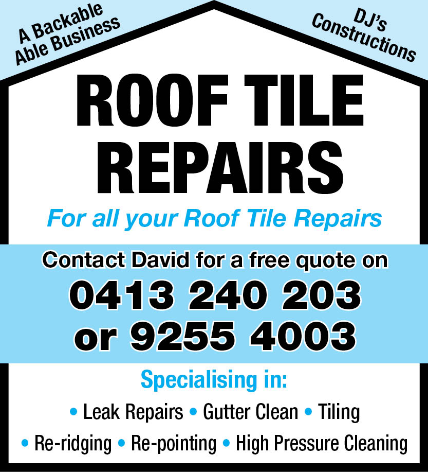 David is your local Perth Hills roof tile repair specialist with over 30 years’ experience in the industry. Specialising in roof tile repairs, valley gutter replacements, flashing repairs, re-ridging and re-pointing, broken tile repairs, high pressure cleans for roofs, driveways, pathways etc and gutter cleans.