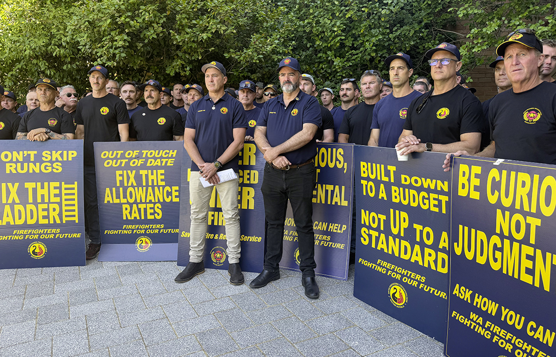 WA firefighters have escalated union action and fronted Parliament House to demonstrate as staffing shortages and pay disputes with the state government continue.