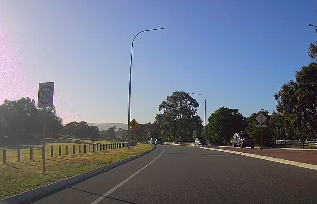 A screenshot of dashcam footage showing the old 70km/h speed sign that was left behind when school zone signage was installed on Gnangara Road.