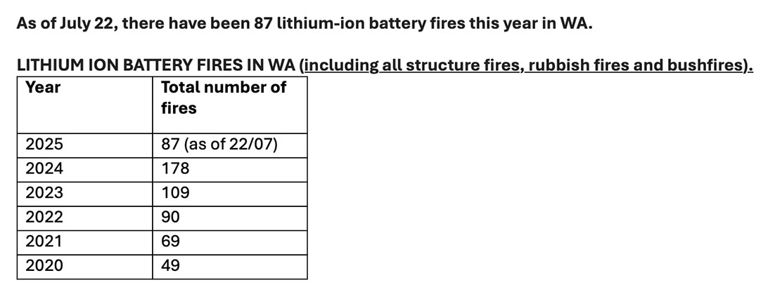 DFES said this year in relation to lithium-ion batteries there had been 49 structure fire incidents, 35 other rubbish incidents and three small bushfire incidents.