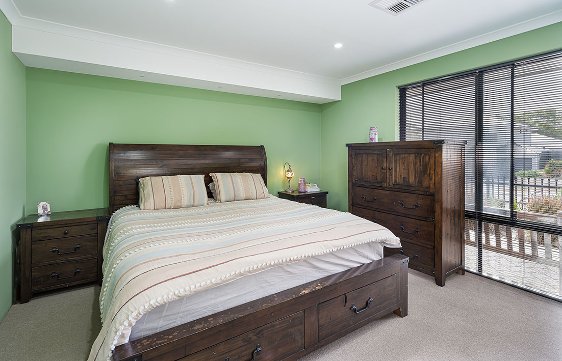 The main bedroom is situated to the right of the entrance and overlooks the front yard.