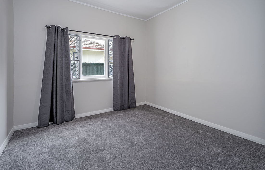 To the right of the living area are the two remaining bedrooms, with the main bedroom comfortably fitting a queen-sized bed while the smaller room fits a single.