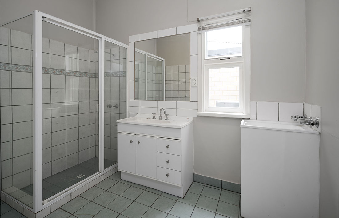The galley layout of the room means the shower, freestanding vanity and laundry sink are all fixed along one wall.